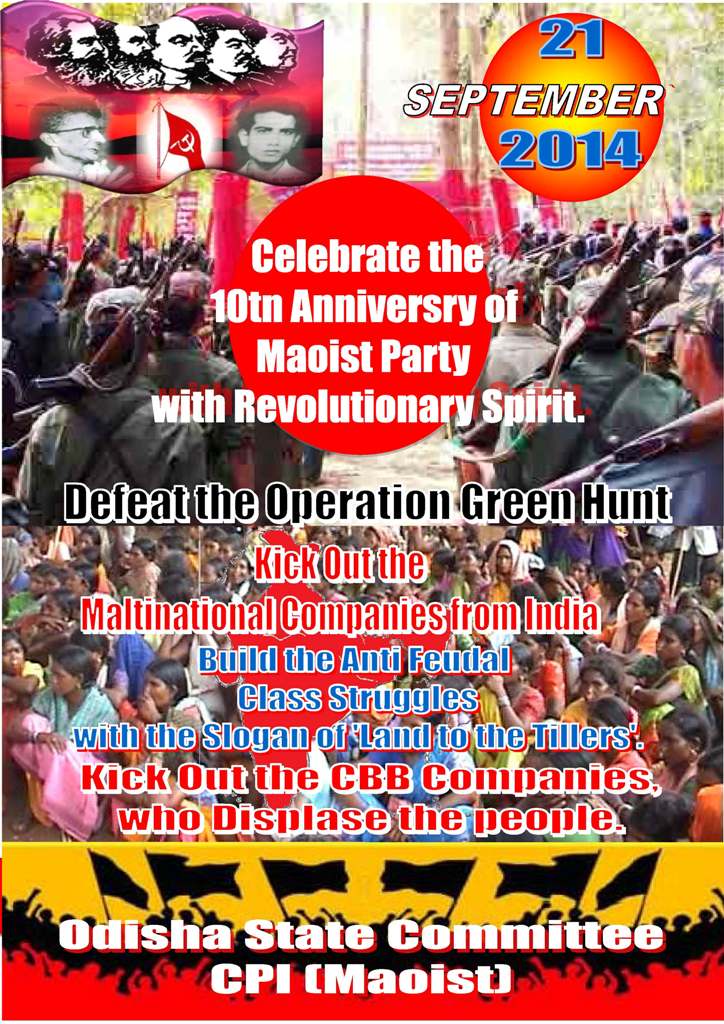 PDF Pamphlet format (152 KB)“Hold High the Bright Red Banner of Marxism-Leninism-Maoism”, by the Central Committee (P) of the CPI(Maoist), Sept. 21, 2004.