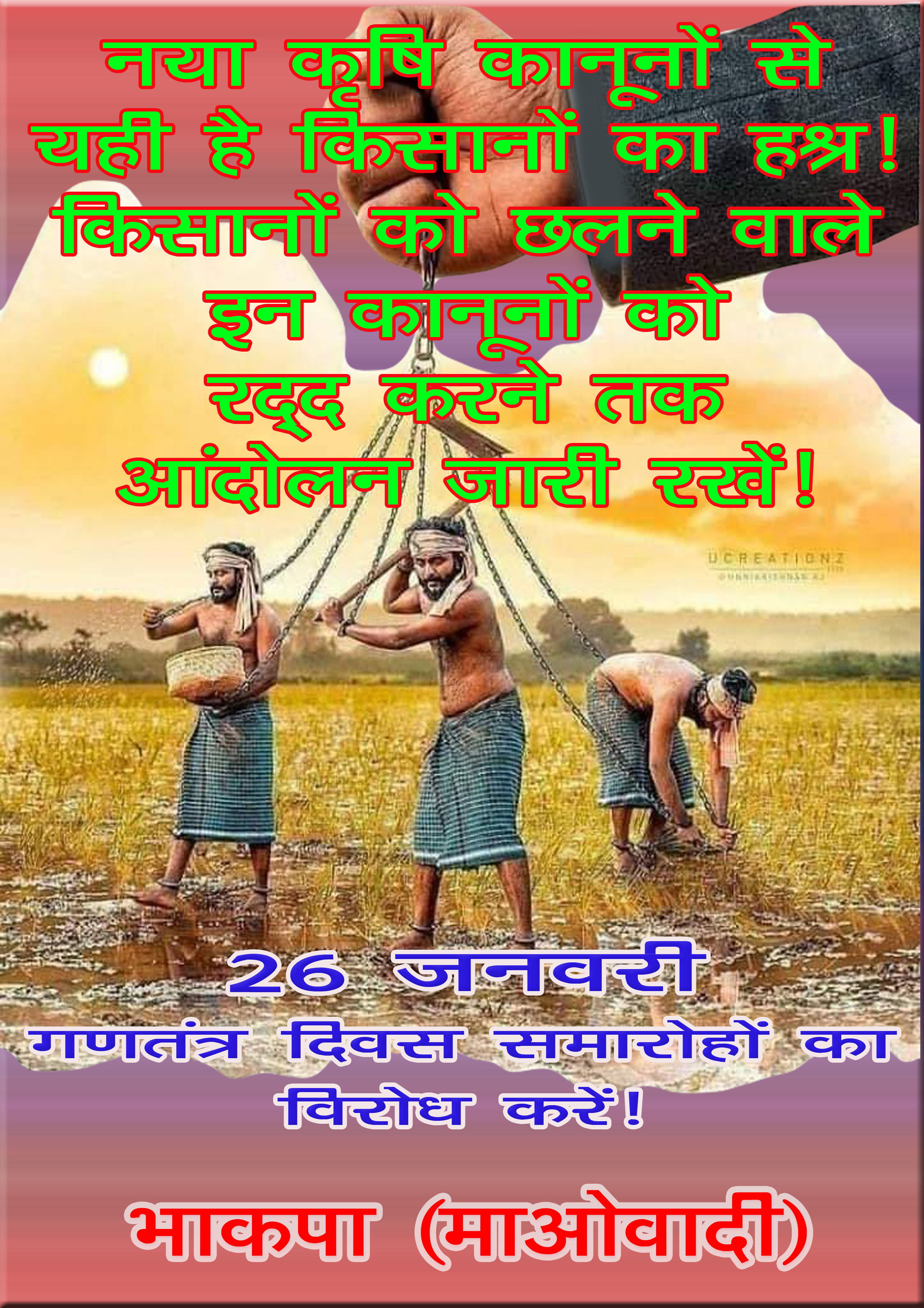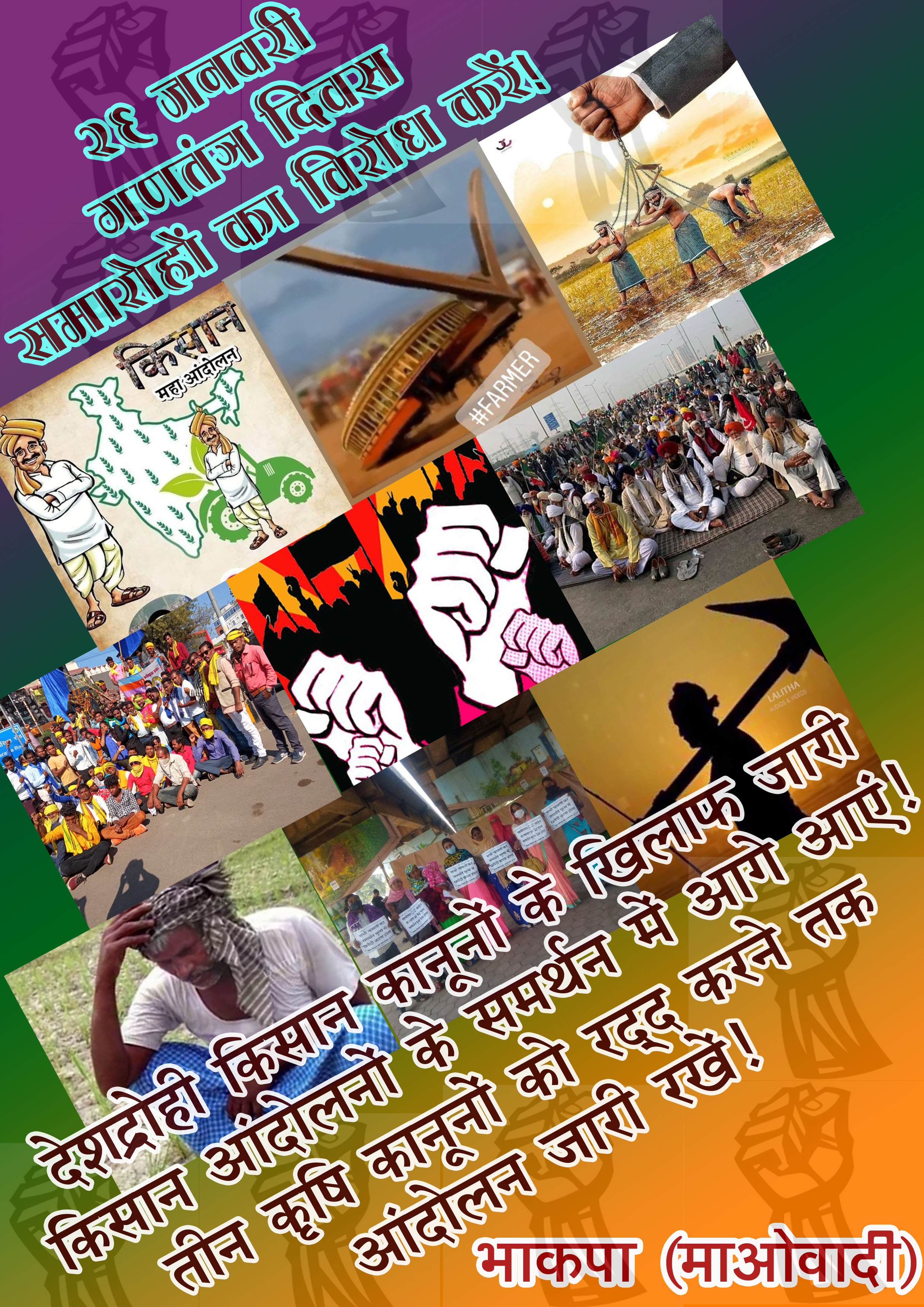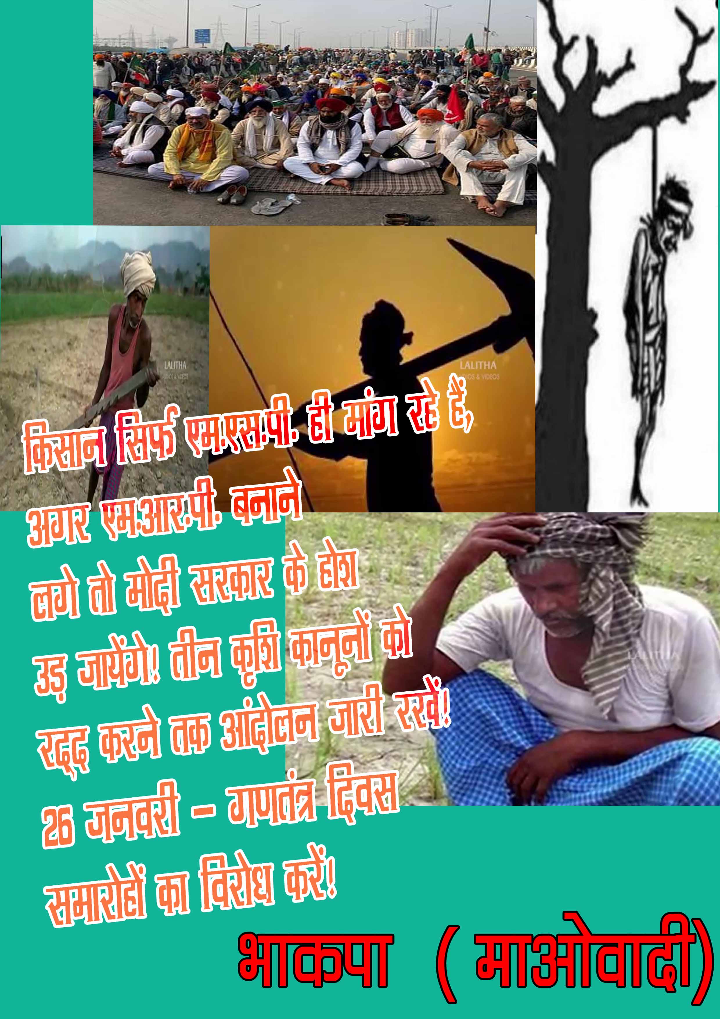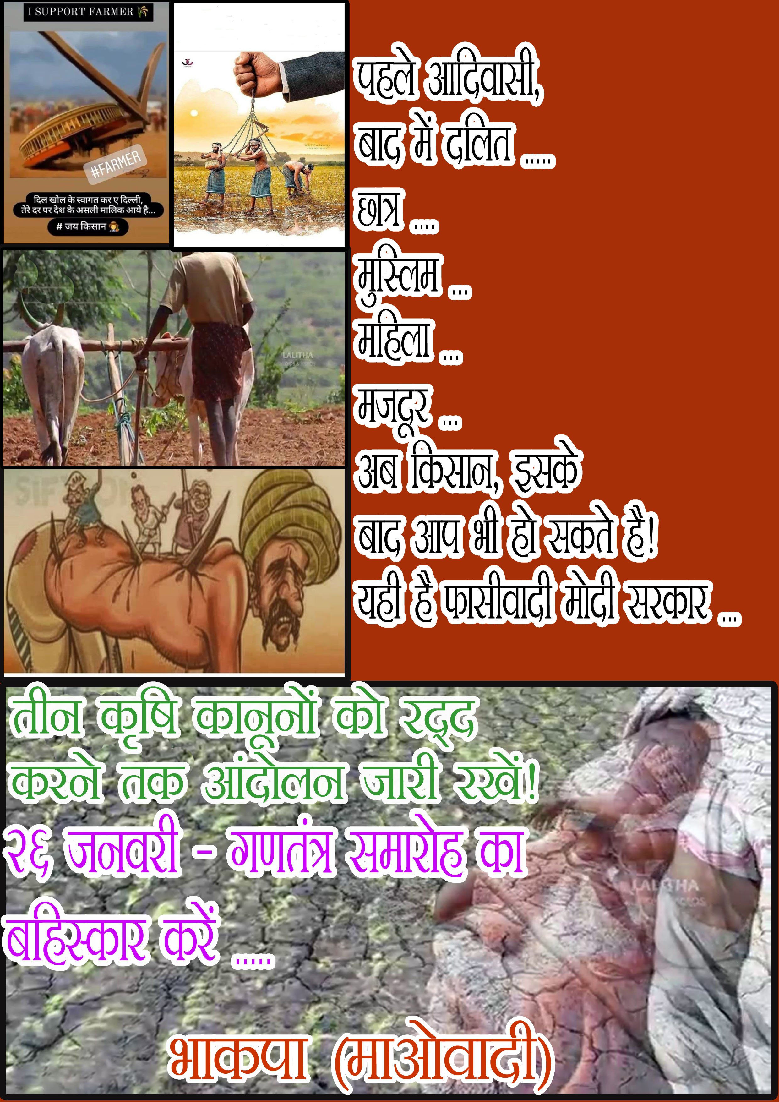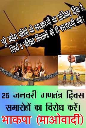 January 31 Statement: “Make a success of the ‘Day of Betrayal’ call given by Samyukta Kisan Morcha on 31st January! Hold militant demonstrations in front of the district, mandal and tehsil government offices against the BJP government that trampled the promises at the time of withdrawing the 3 Agrarian Laws!”, statement by Abhay, Spokesperson for the Central Committee of the CPI (Maoist), January 27, 2022. English: Searchable PDF format [1 page; 435 KB]; Hindi: Searchable PDF format [2 pages; 68 KB]; Telugu: Searchable PDF format [1 page; 56 KB]