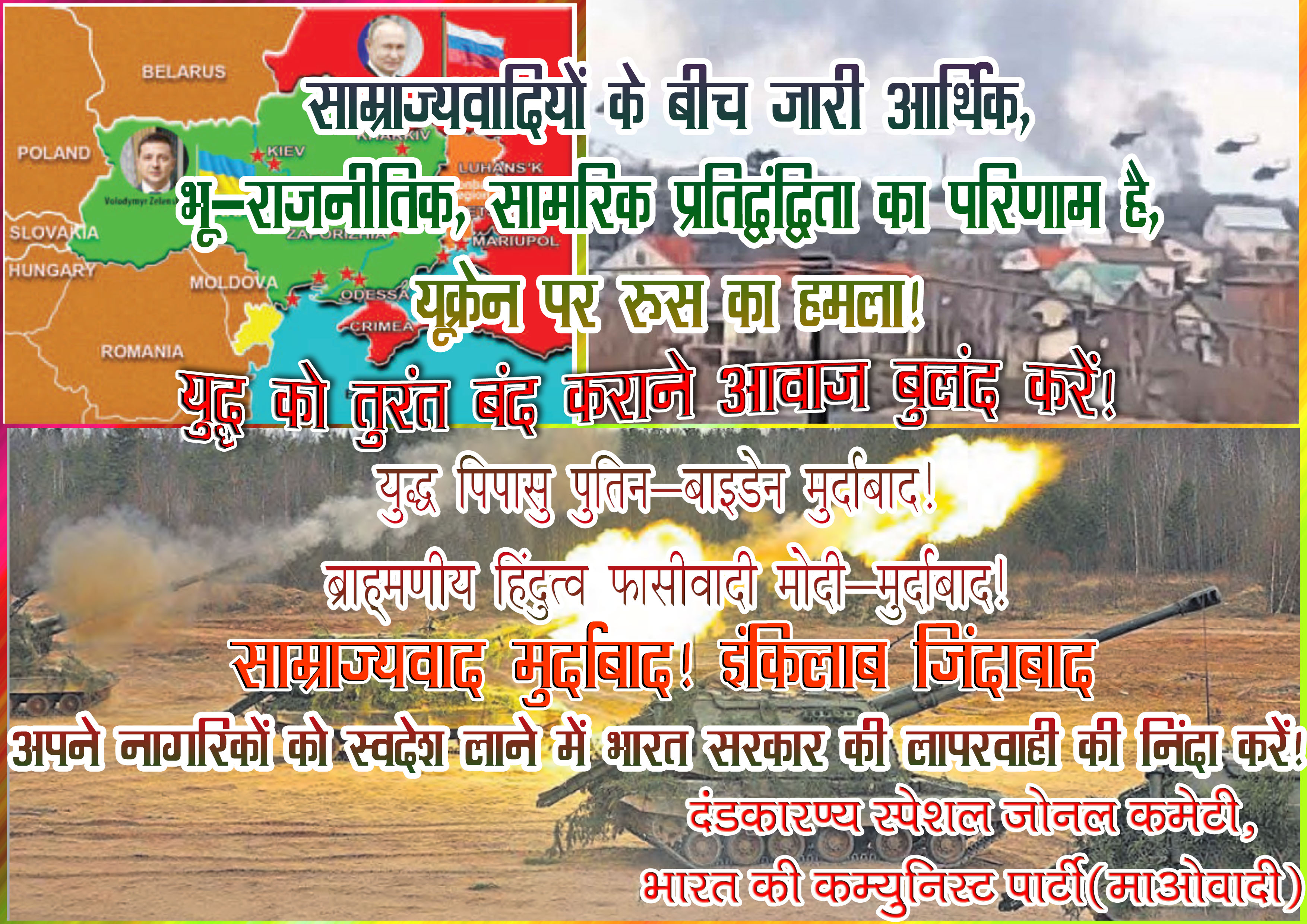 Statement on Russian Aggression on Ukraine, by the spokesperson for the Dandakaranya Special Zonal Committee, CPI (Maoist), March 1, 2022, 2 pages. Statement in Hindi: PDF format [2 pages; 58 KB]; Leaflet in Hindi: PDF format [1 pages; 265 KB]; Pamphlet in Hindi: PDF format [2 pages; 228 KB]; Color Poster in Hindi: jpg format [1 page; 1,511 KB]