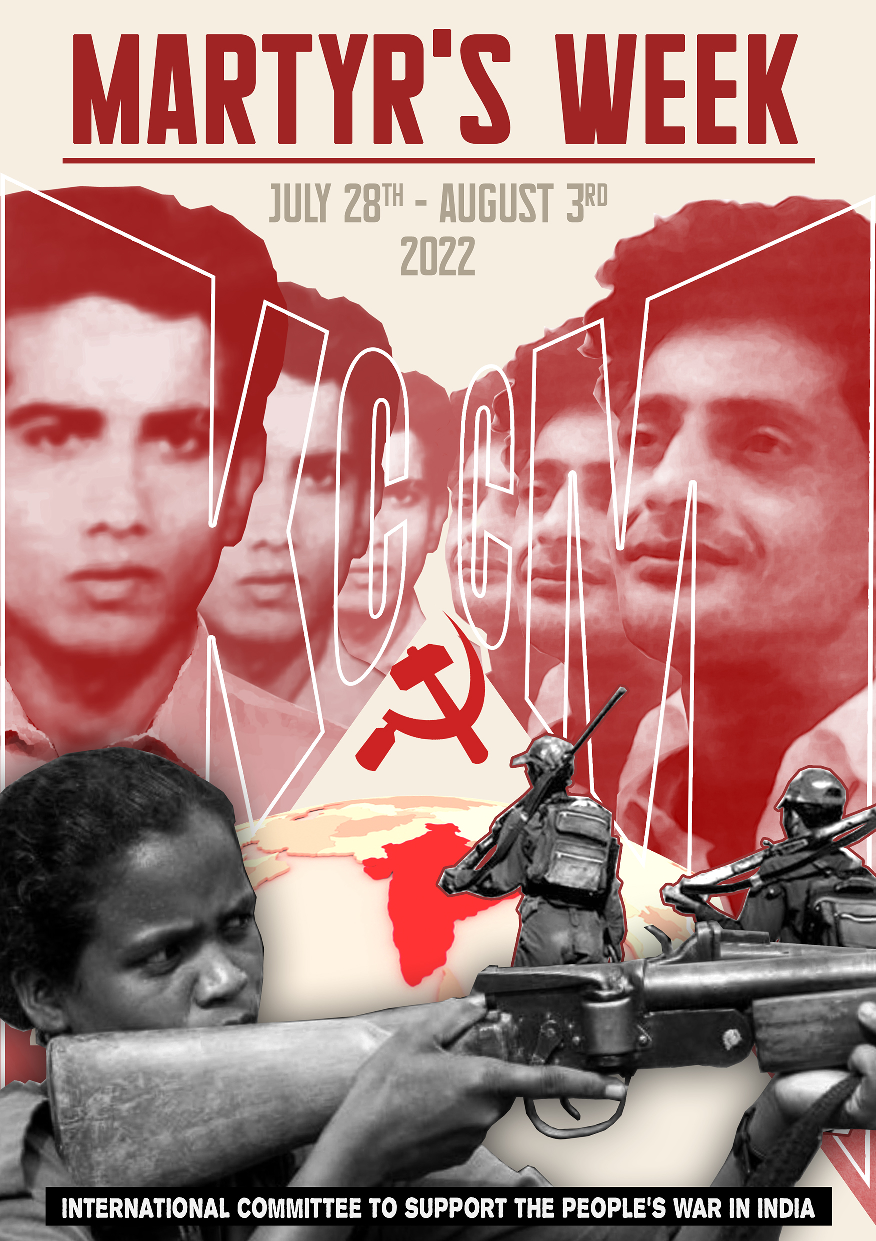 Call and posters issued by the International Committee to Support the People's War in India, for “Martyr's Week: July 28th to August 3rd”. English Poster: JPG format [1,759 KB]; English Poster: PDF format [744 KB]; English Call: MS Word (.docx) format [9 KB]