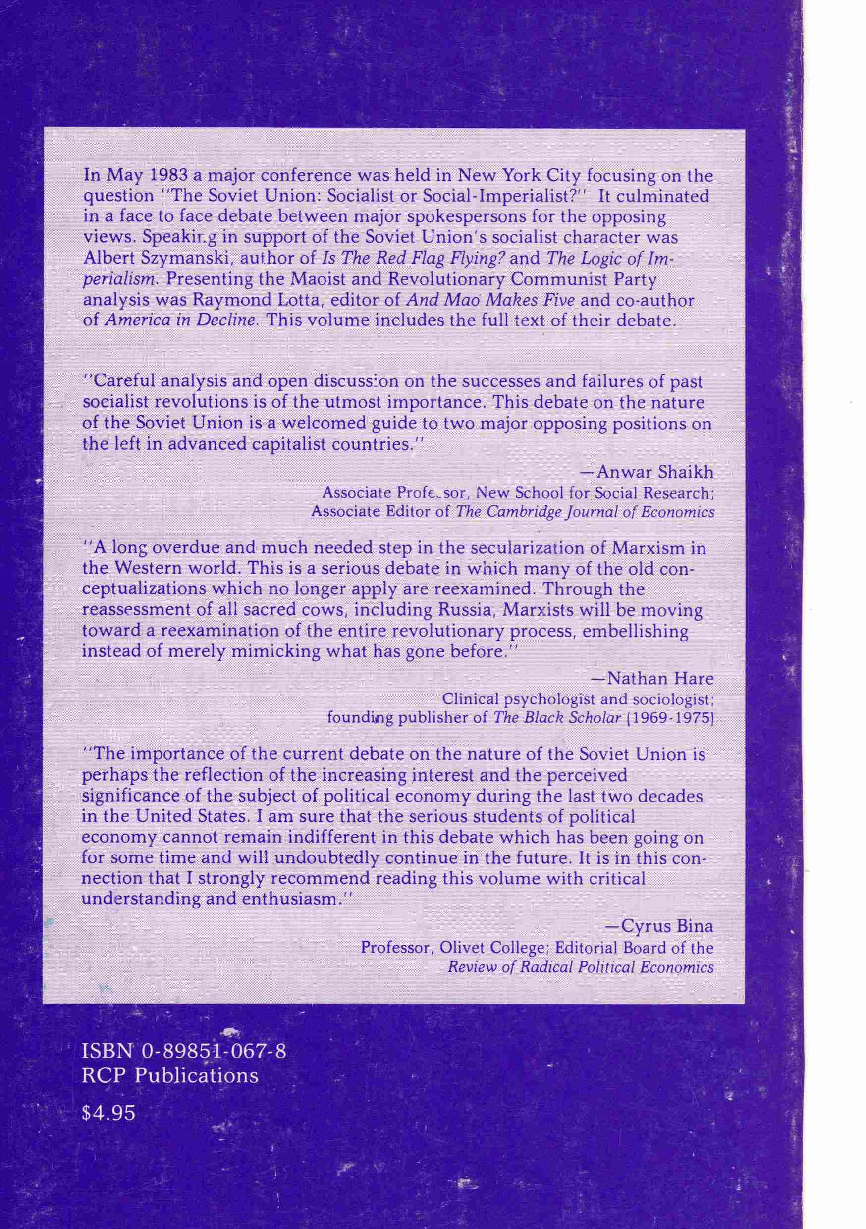 - [Book:] The Soviet Union: Socialist or Social Imperialist? Part II: The Question Is Joined, Raymond Lotta vs. Albert Szymanski, full text of the New York City Debate, May 1983. (Chicago: RCP Publications, 1983), 90 pages.