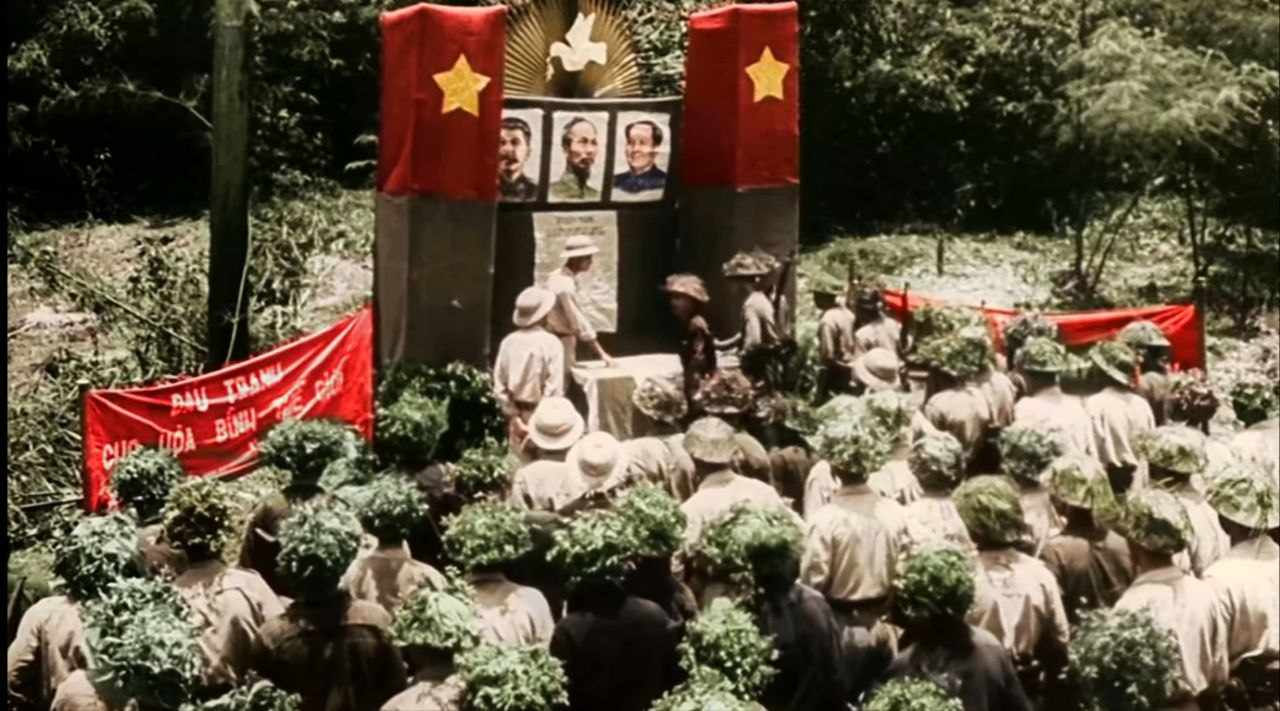 Viet Minh soldiers at a political meeting during the revolutionary war against French imperialism.