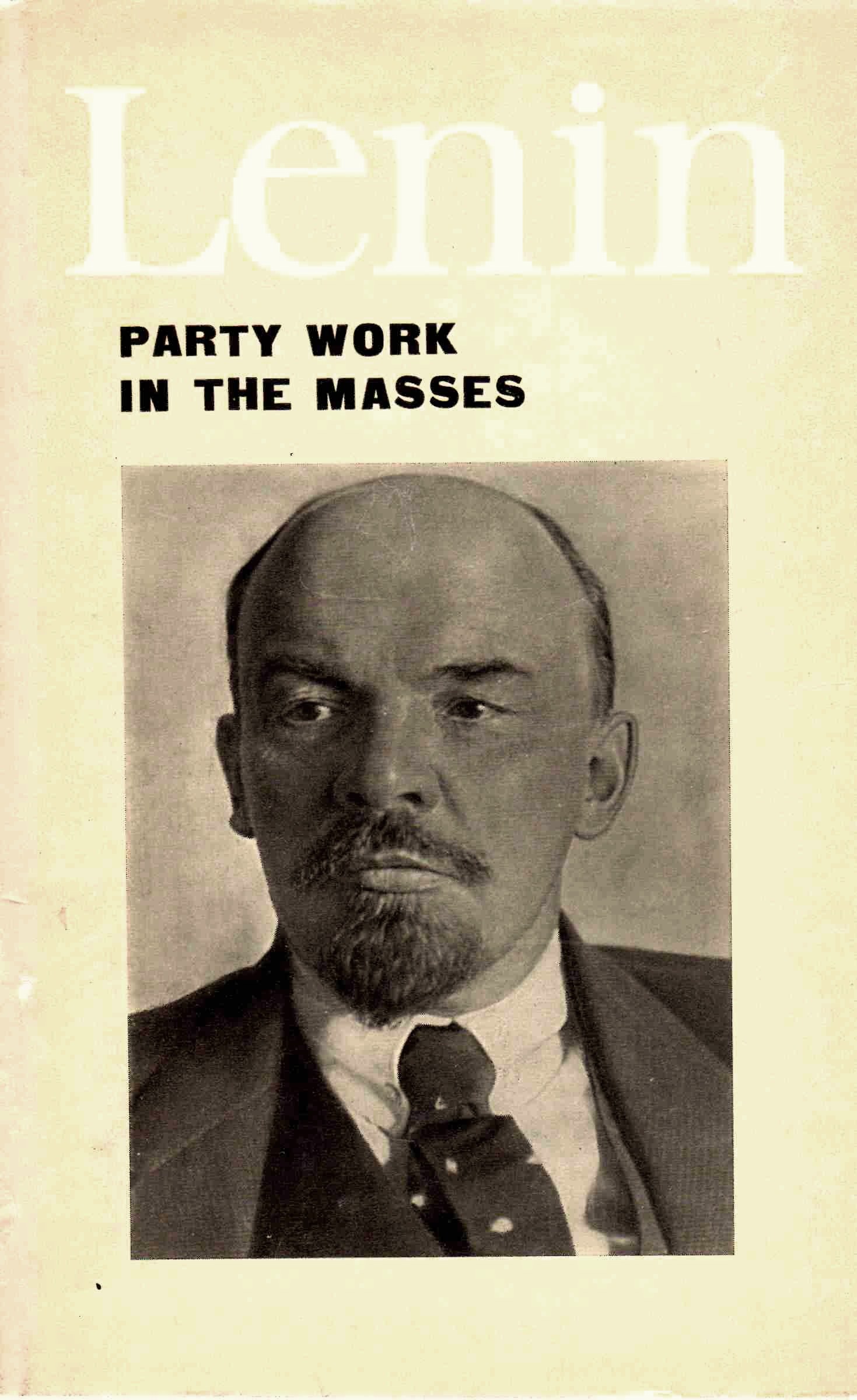 - [Book:] V. I. Lenin: Party Work in the Masses, articles and speeches, including excerpts from his longer works, (Moscow: Progress Publishers, 1969), 170 pages. This is a collection of some of Lenin’s important writings about how to carry out work among the masses, which every communist should be very familiar with. [Note: This book is available in searchable PDF image format. Because of the large size of the scanned book, each separate article has been made available as a separate file.]